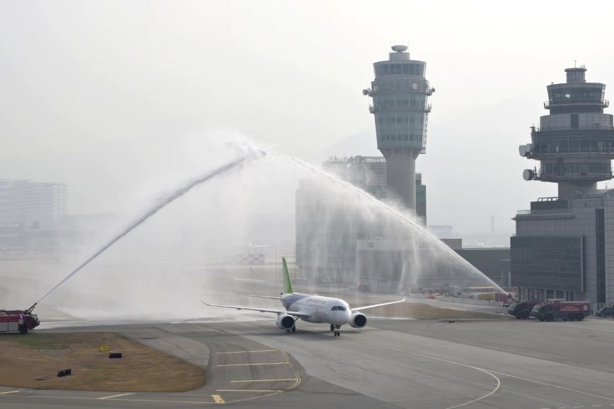 دشنت الصين أولى رحلات لطائرة ركاب صينية الصنع من طراز "سي919" و"إيه آر جيه 21" خارج البر الصيني عندما حطت أمس في مطار هونغ كونغ الدولي.